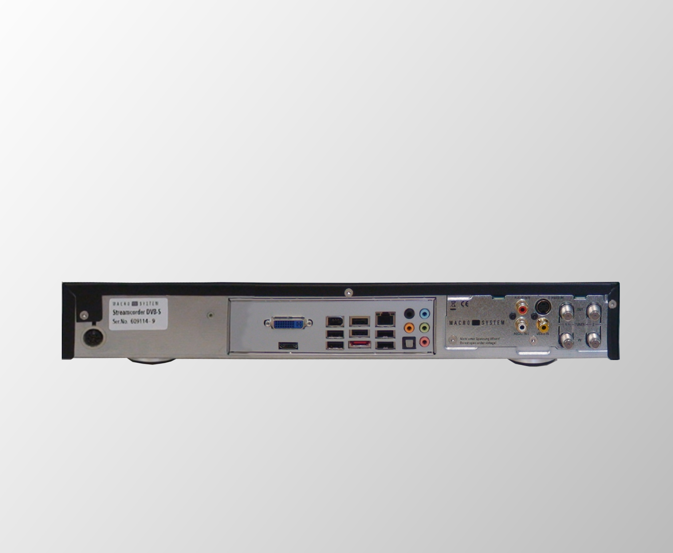 Das Gerät ist mit der DVC-typischen, edlen Glasfront ausgestattet. Auf Grund der geringen Bauhöhe und der einfachen Verkabelung (Netzteil, Antennenkabel und HDMI) kann der Streamcorder auch unauffällig installiert werden.